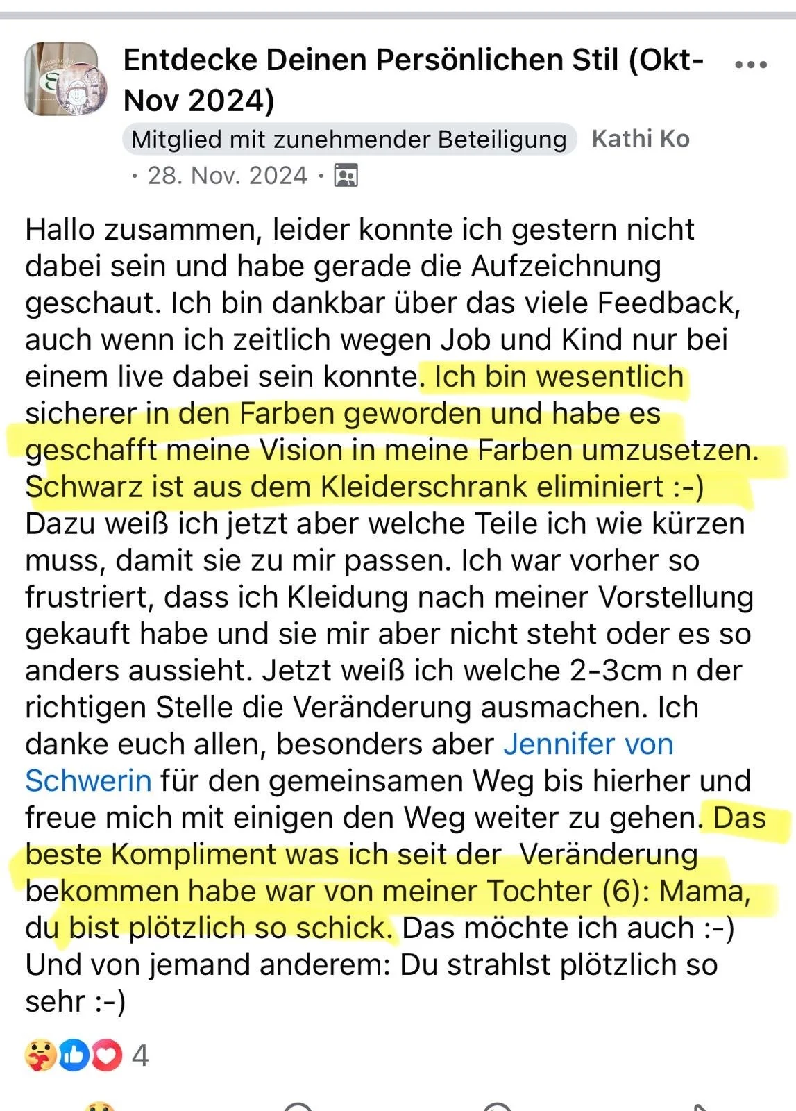 Tritt unserer privaten Facebook-Gruppe bei (optional) und erhalte Unterstützung von Jennifer und anderen Frauen, die sich ebenfalls auf ihrer Stilreise befinden. Poste deine Fragen oder Outfits und erhalte hilfreiches Feedback, das deine Stilentwicklung auf das nächste Level heben. Hier findest du die Inspiration und Motivation, die du brauchst!