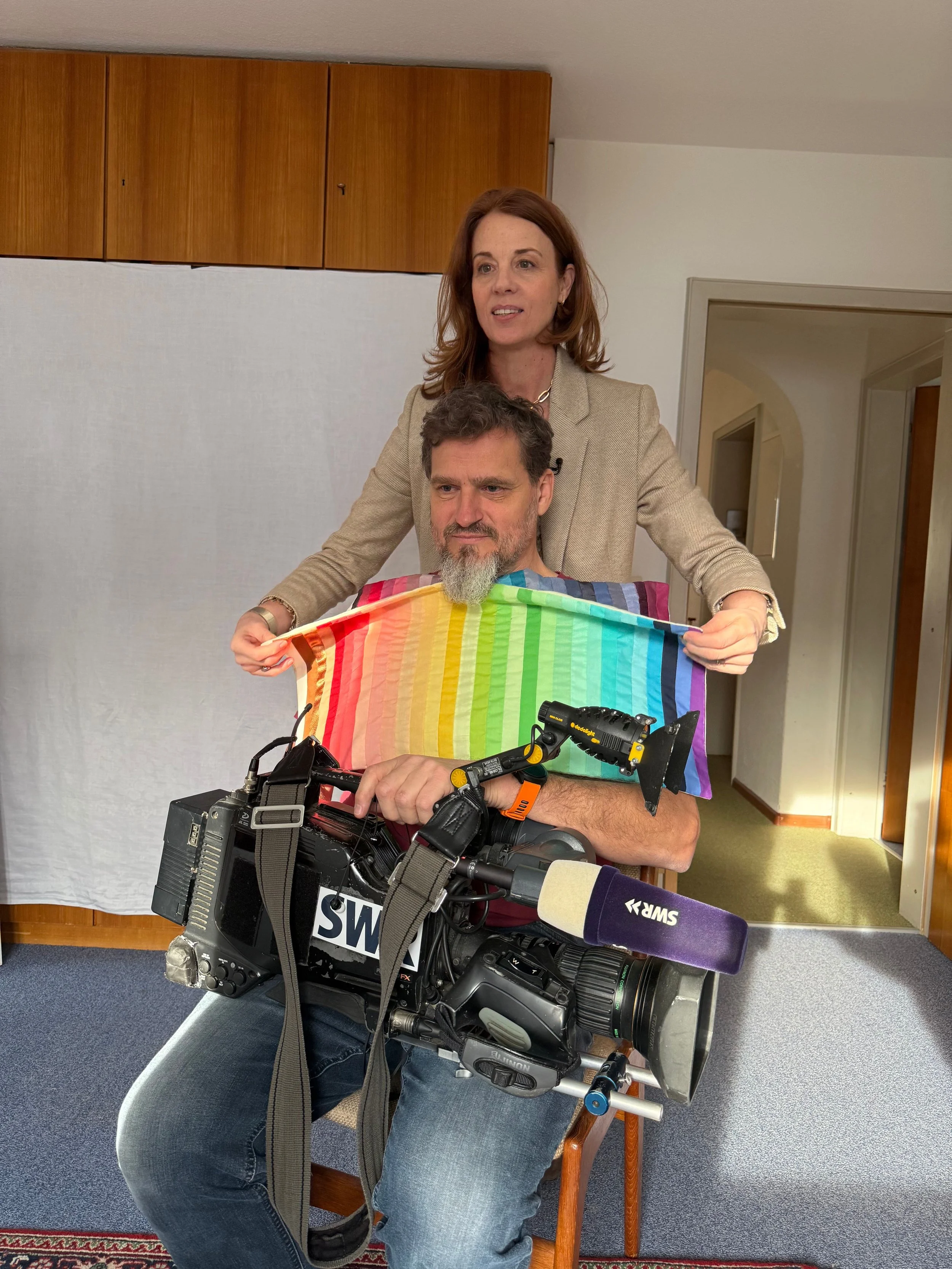 Jennifer von Schwerin erklärt in der SWR Landesschau die Vorteile der Farbanalyse – und selbst der Kameramann war begeistert, seinen Farbtyp zu entdecken!